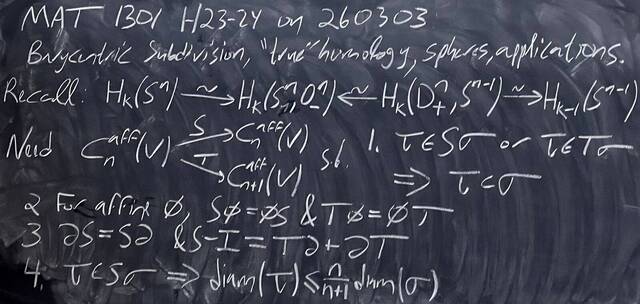 260303-165805: March 3, H23-24: Barycentric subdivision, reduced homology, spheres, applications (5).
