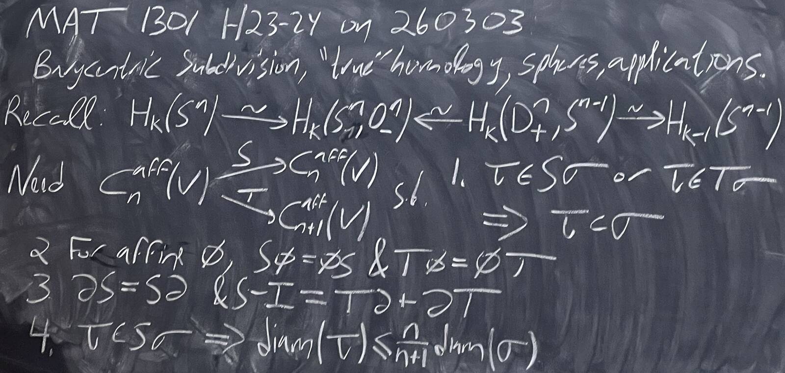 260303-171746: March 3, H23-24: Barycentric subdivision, reduced homology, spheres, applications (6).